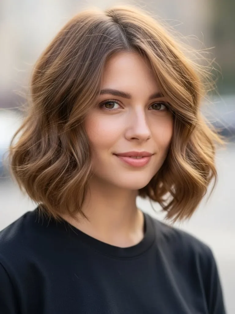 This shoulder-skimming choppy bob has loose waves that add texture and movement to fine hair. The warm caramel highlights catch the sun and give the whole style a pretty glowy effect.