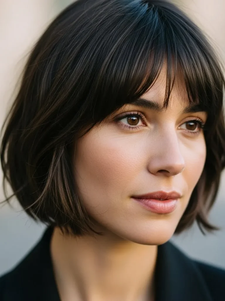 This short bob sits just at the jawline with a soft wispy fringe that blends seamlessly. The dark brunette color adds depth while the choppy layers create gentle lift.