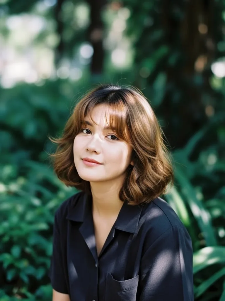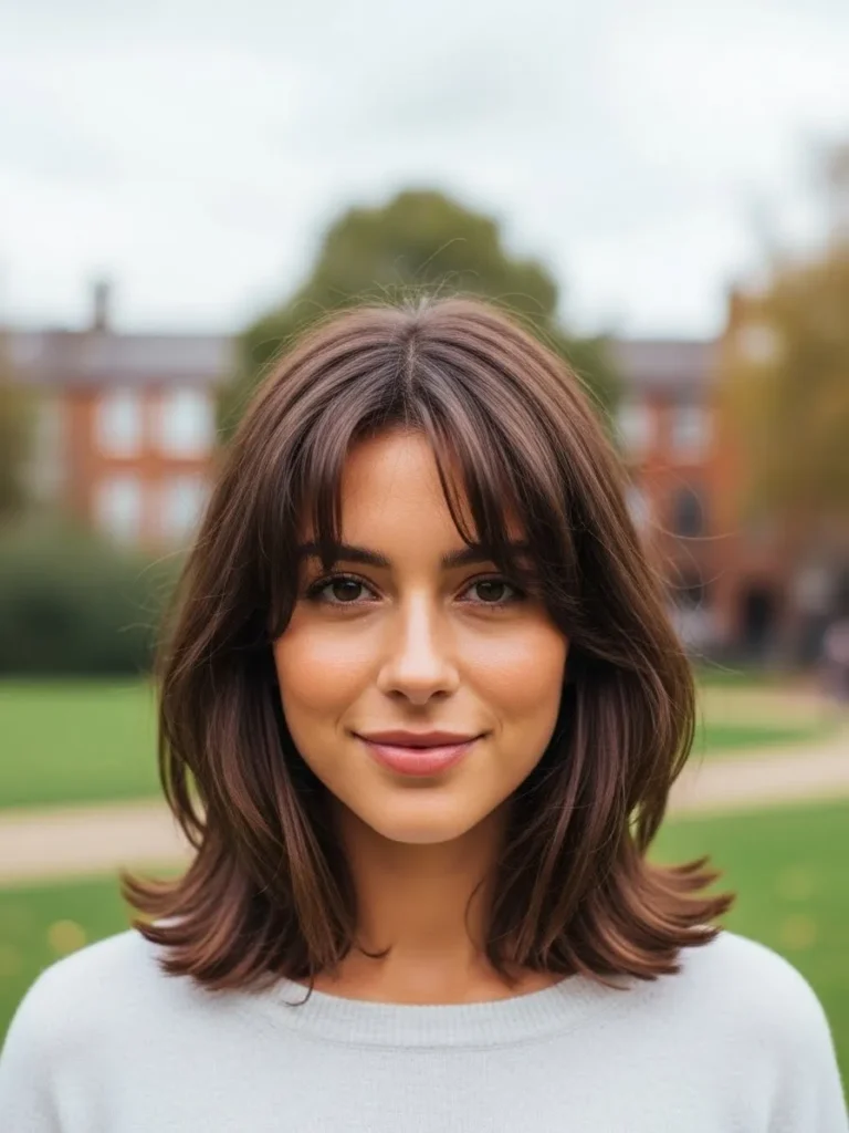 This hairstyle is super cute and features a rich chestnut brown color that catches the light beautifully. It sits just above the shoulders and has rounded ends that create a lovely soft silhouette. The wispy curtain bangs really bring the whole look together by gently framing the eyes.