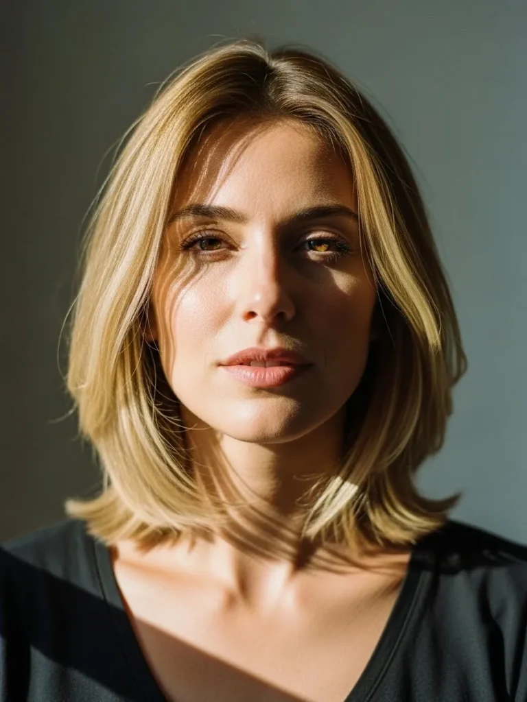 This layered bob falls just below the chin with gentle movement through the ends and a natural center part. The color is a warm honey blonde with lighter ribbons around the face that catch the light beautifully. Layers are subtle and airy, giving the hair a soft shape without looking overly styled. The finish feels smooth but still relaxed, like hair that behaves well on its own.