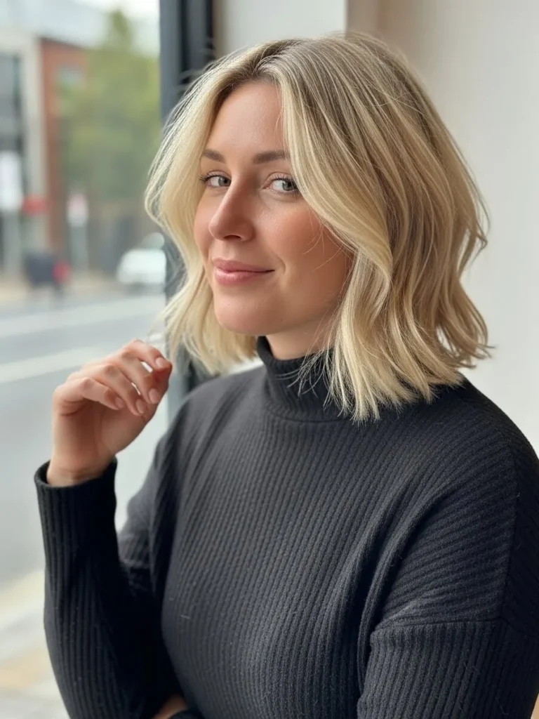 I love this style because it feels youthful and carefree. The texture keeps the bob from feeling too precise, and the blonde shade gives that healthy glow everyone wants. It is easy to wear, easy to style, and always looks good in natural light.