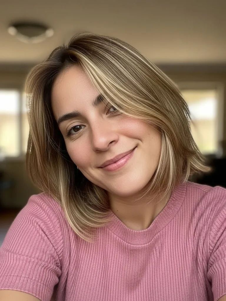 I really like how the face framing pieces draw attention to the eyes and cheekbones. The blonde tones brighten everything up without looking too bold. It is one of those hairstyles that makes you feel instantly refreshed.