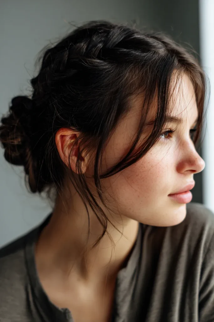 For me, this look is a total game-changer for those days when you want to feel a bit more sophisticated but still keep that effortless cool-girl energy. It works so well because the low bun is super comfortable for sitting in chairs with high backs all day, while the braid adds enough detail to make it feel special. I find it incredibly flattering because those loose pieces around the face highlight your cheekbones and give a really dreamy vibe to any casual school outfit.