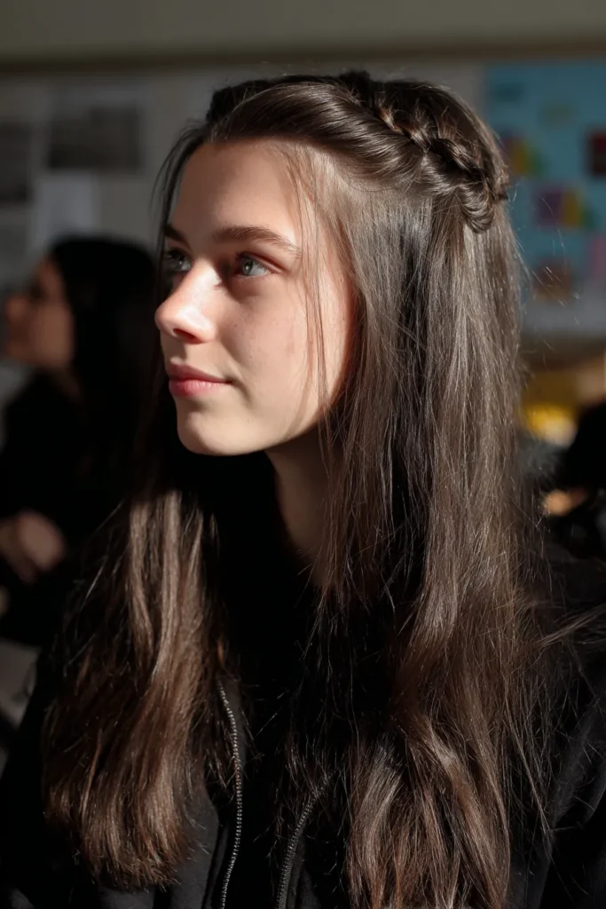 I think this is such a dreamy choice for a school presentation or picture day when you want a little extra confidence. It feels so romantic and put together while keeping the hair out of your eyes so you can actually focus on your work. The braid adds that perfect touch of detail that makes the whole style feel special.