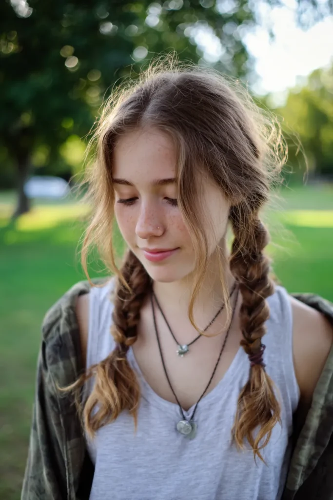 This sweet and casual style features two loose pigtail braids that start low behind the ears. The hair has a natural sun-kissed golden brown color with plenty of lived-in texture and flyaways that add to its charm. Long wavy layers are left out to frame the face beautifully, while the braids themselves are thick and slightly pulled apart for a fuller look. It is a medium-length style that feels wonderfully unstudied and perfect for a busy day outdoors.