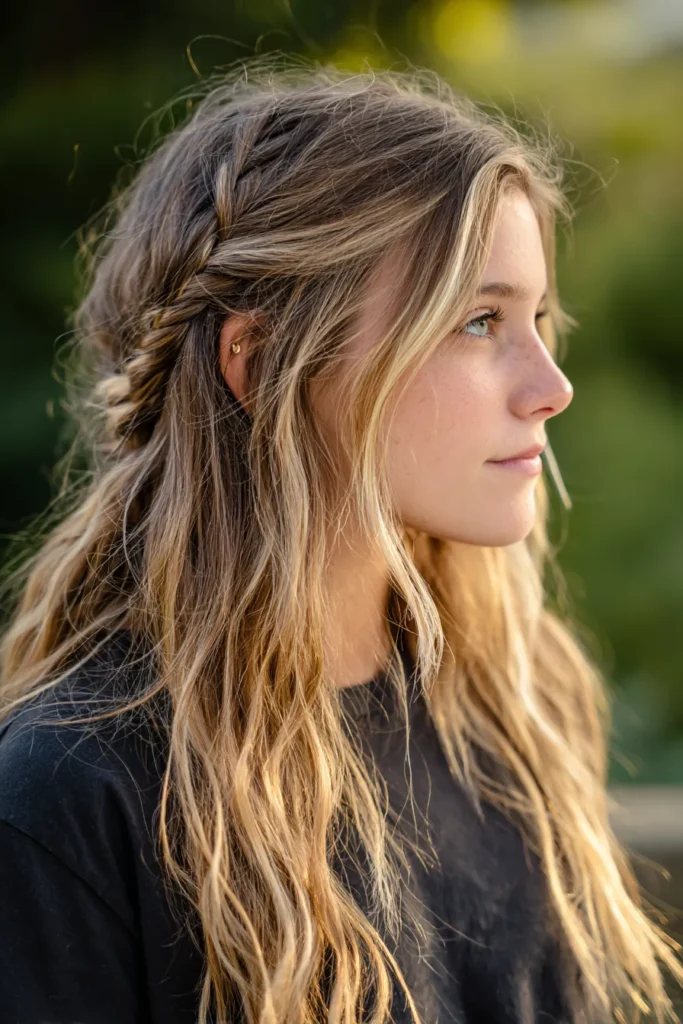 This effortless look features long beachy waves in a stunning blend of sandy blonde and honey highlights. A loose bohemian braid starts near the temple and winds back into a half-up style, which keeps the hair neatly away from the face while maintaining a relaxed profile. The texture is intentionally tousled with soft layers that create natural volume and movement throughout the length. It is a perfect choice for those who love a free-spirited aesthetic that feels both feminine and practical for a busy school schedule.