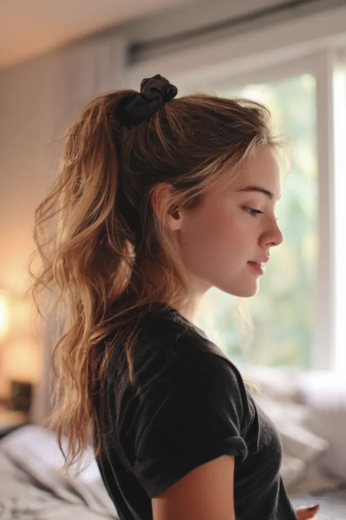 If you prefer a sporty but cute aesthetic, then this elevated ponytail is going to be your absolute staple. I think it works so well because the height of the pony creates a natural face lift while the scrunchie adds a pop of personality to a basic t-shirt. I find it especially flattering because those messy wisps around the hairline soften the overall shape, so you never have to worry about that overly tight or severe look during a long day at school.