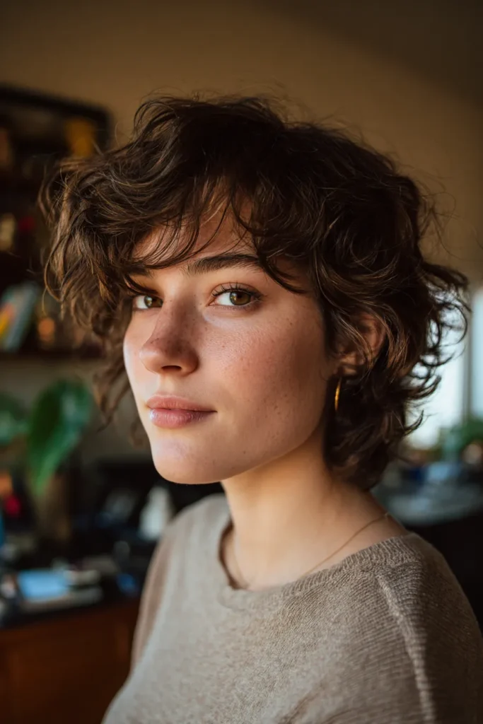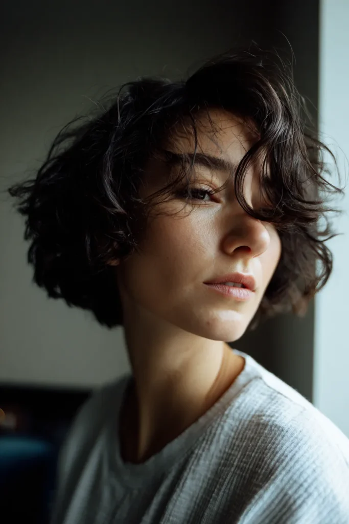 This dreamy cut showcases a perfect ear-length crop that is all about volume and soft movement. The style boasts messy, touchable curls and a heavy fringe that skims the eyebrows for a look that is both vintage and modern. It showcases a natural espresso base with very fine, sun-kissed highlights that add depth to the tousled layers. Everything about this look feels airy and relaxed with just enough structure to keep it looking intentional.