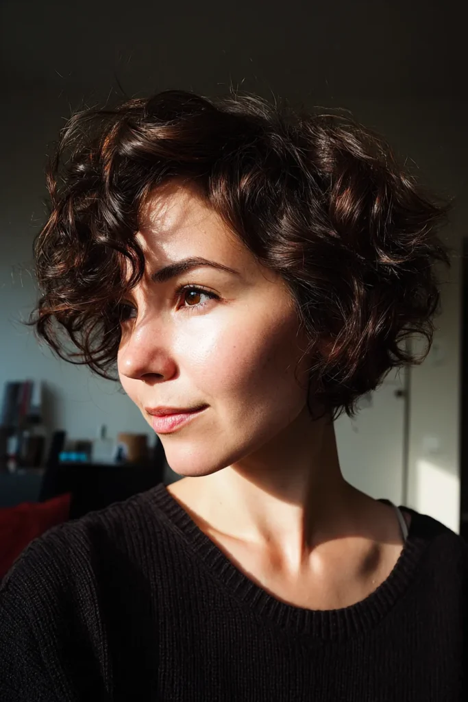 Rich brunette tones also look beautiful on short curls. Chocolate, espresso, and chestnut shades give hair shine and depth while keeping the look polished and chic.