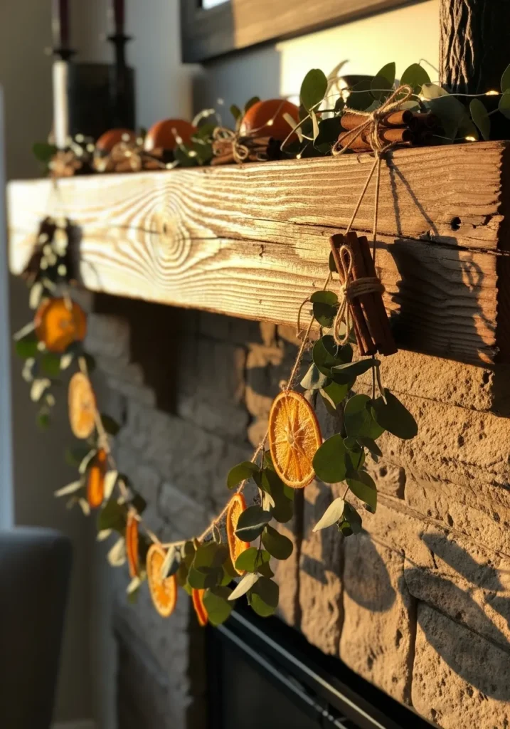This mantle feels warm and inviting with its natural, handmade touches. Slices of dried oranges hang alongside fresh eucalyptus, while cinnamon sticks tied with twine rest on top of a rustic wooden beam. The soft glow of golden sunlight gives everything that cozy farmhouse feel that makes winter days feel extra special.