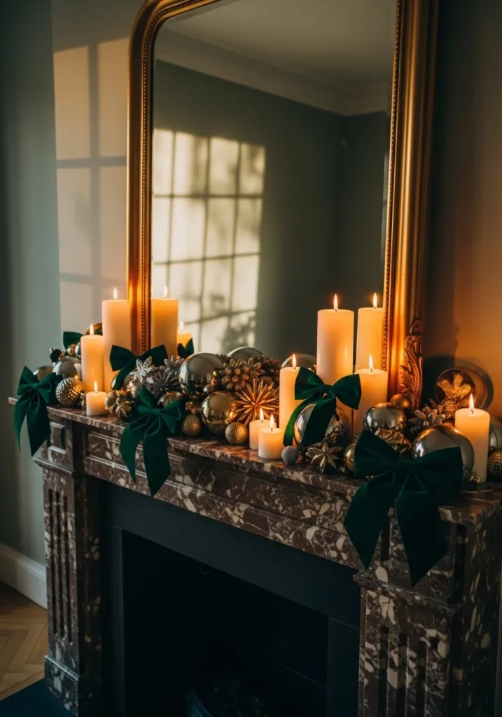 This glamorous setup feels rich and moody in all the right ways. The dark marble mantle is dressed with layers of metallic ornaments, golden accents, and lush green velvet bows. Dozens of candles in varying heights add a flickering glow that makes the entire display feel warm, elegant, and slightly mysterious.
