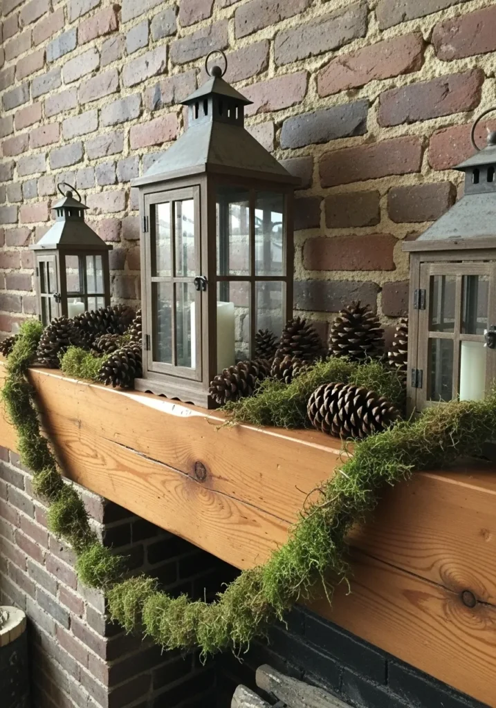 This nature-inspired mantle embraces rustic charm with moss, pinecones, and weathered lanterns that glow softly with candlelight. The natural textures against the brick wall give it an earthy, cozy feel that makes the space instantly welcoming. It’s the kind of design that celebrates the simple beauty of winter in the woods.