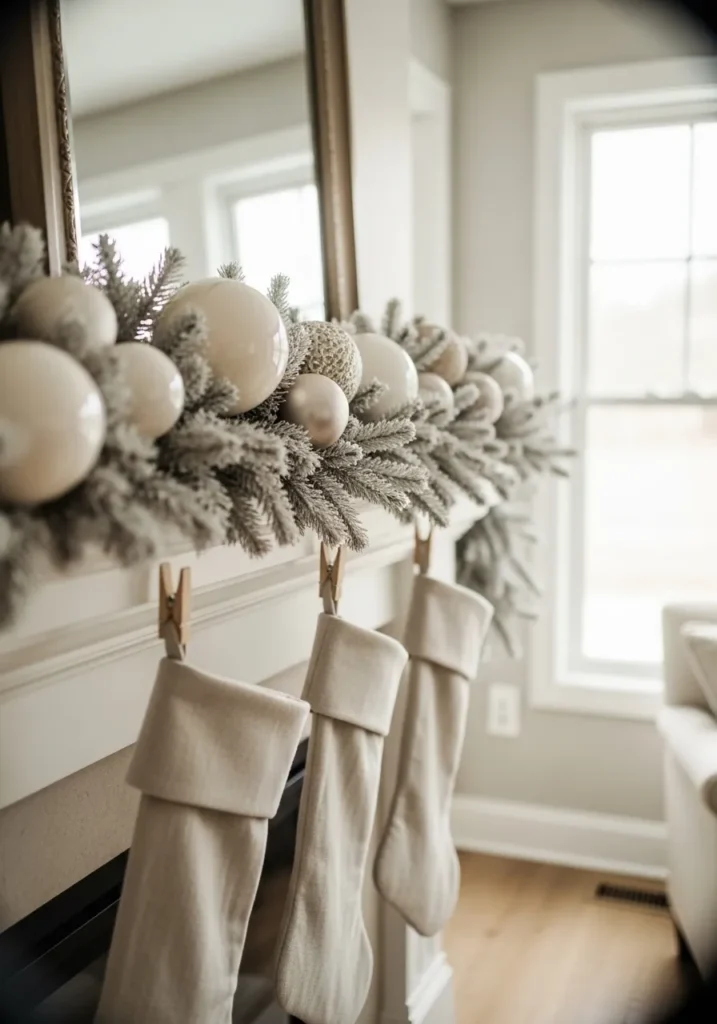 Soft tones and frosted textures make this mantle look like it’s straight out of a snowy dream. Cream stockings hang beneath a layer of snowy evergreens and matte white ornaments that sparkle gently in the light. The neutral palette keeps it serene, while the mix of textures gives it a quiet kind of glamour.