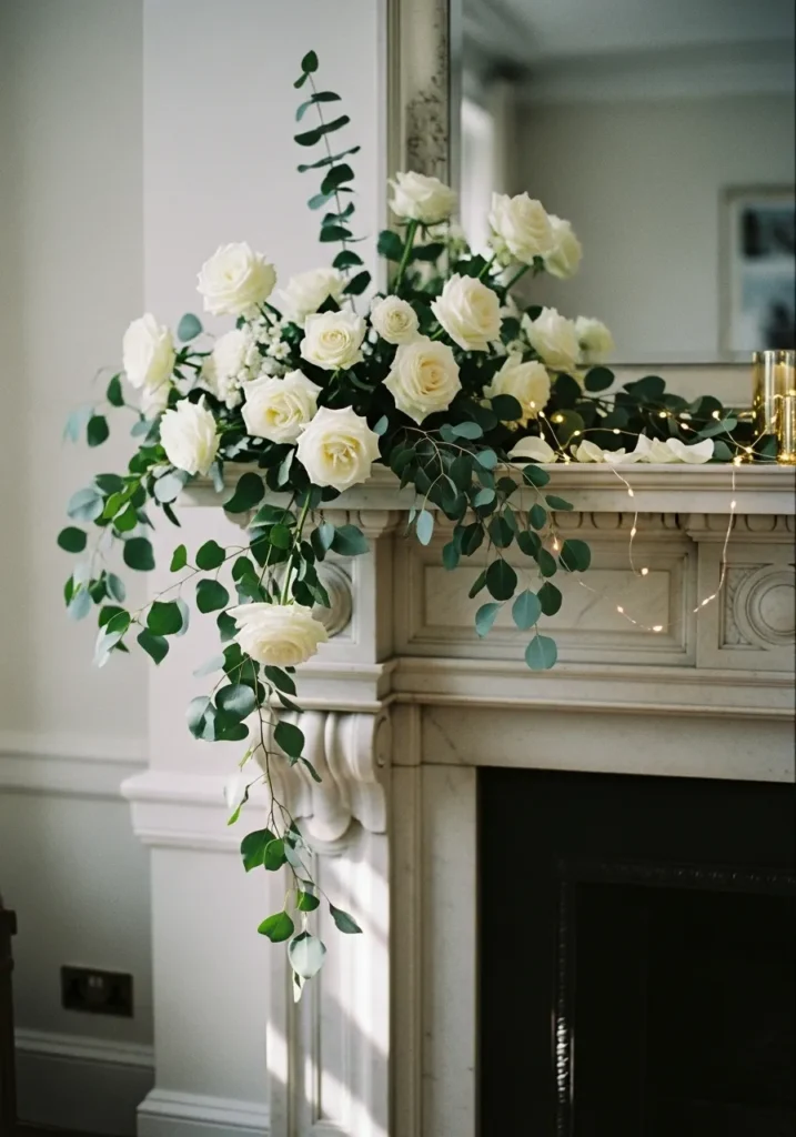 This fresh floral mantle feels like winter elegance brought to life. White roses and eucalyptus spill gracefully over the fireplace, intertwined with fairy lights that give everything a soft golden glow. The result is timeless and delicate, with a natural beauty that instantly brightens the space.