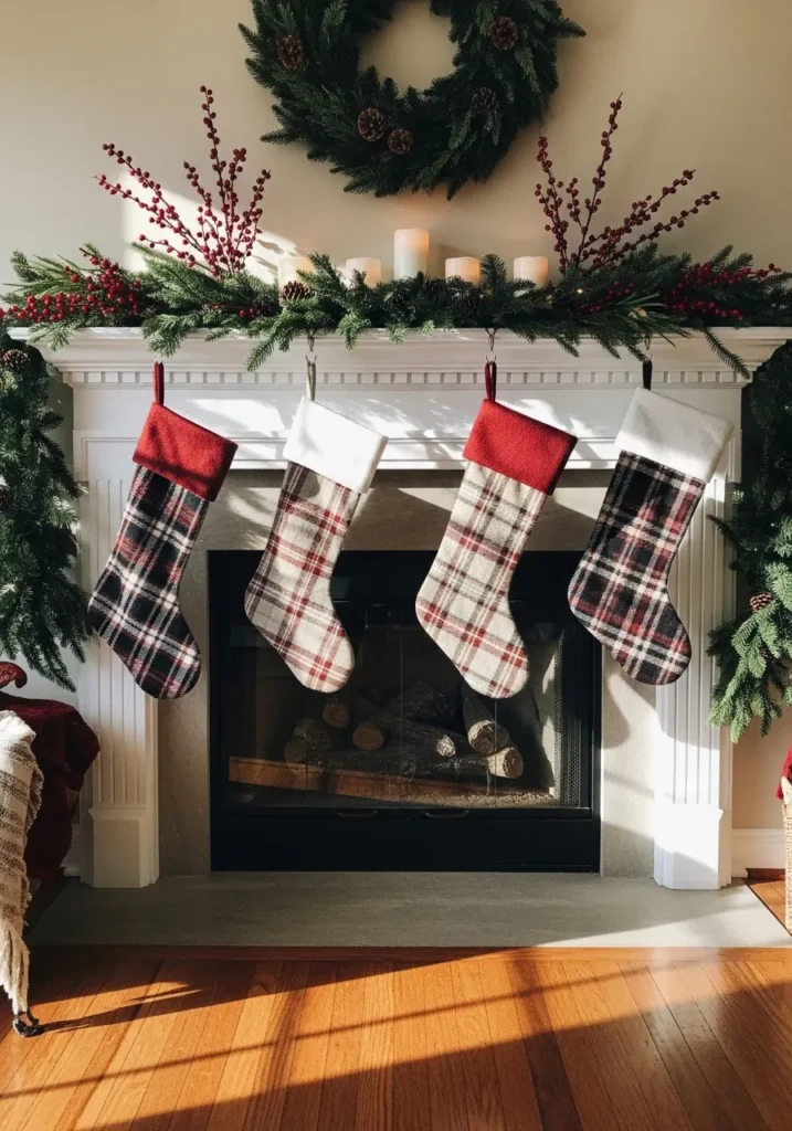 This cozy Christmas mantle brings timeless charm with its mix of red plaid stockings, lush greenery, and pops of bright red berries. A full wreath above the fireplace ties it all together, while soft candlelight glows from behind, creating that warm, festive feeling everyone loves. The design feels perfectly balanced between traditional and cheerful, with a touch of rustic elegance.