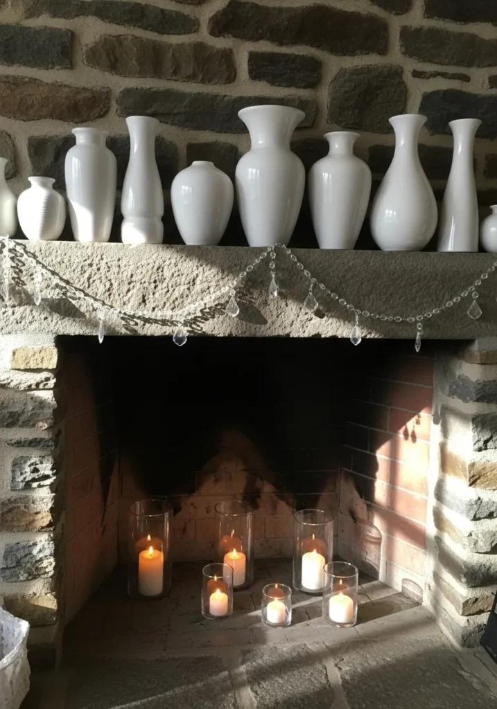 This stunningly simple mantle takes a modern, minimalist approach to Christmas decor. A row of sculptural white vases lines the stone mantle, catching soft daylight and creating a sense of quiet sophistication. A delicate crystal garland adds just enough sparkle, while candles in clear glass holders glow gently from the hearth below, filling the space with warm, golden light.