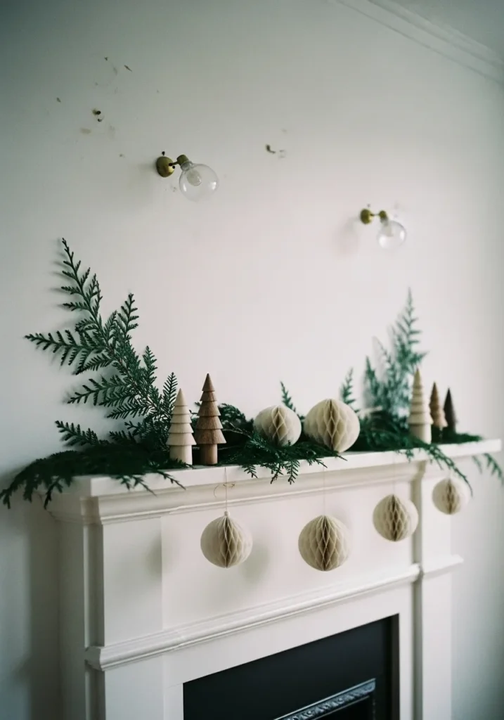 This minimalist mantle design celebrates simplicity with natural evergreen branches, wooden trees, and soft paper ornaments. The tones are muted and calming, with cream and wood accents standing out against the clean white background. Everything feels balanced and uncluttered, which gives the space a serene, modern Nordic charm.