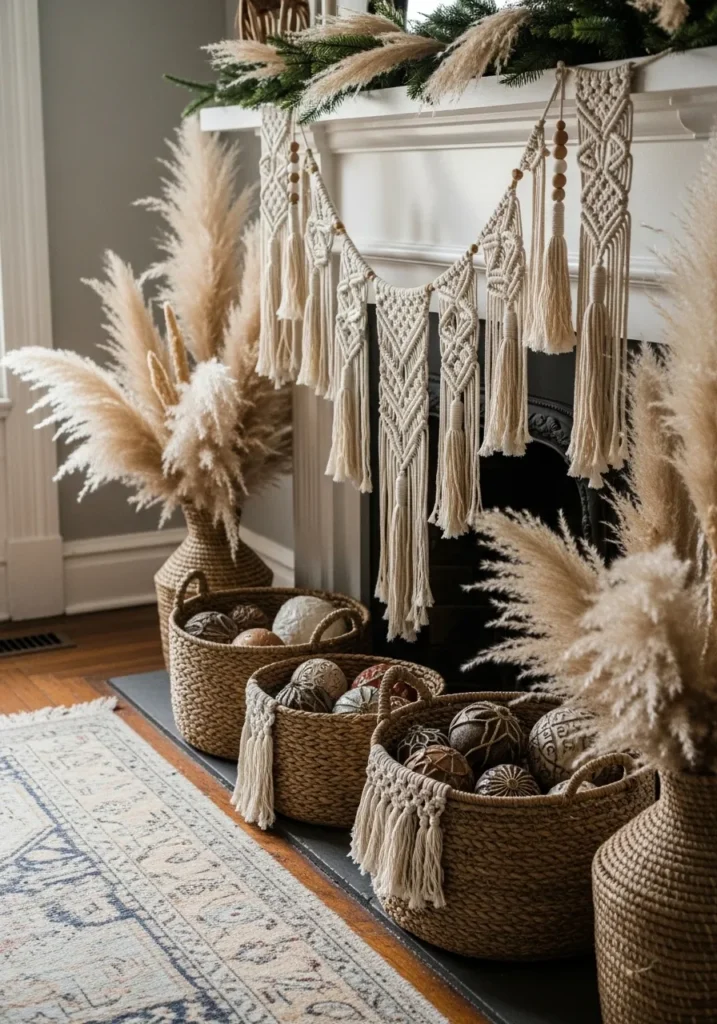 This cozy bohemian mantle is full of texture and natural charm. Soft pampas grass frames the fireplace, while a detailed macramé garland adds a touch of handmade artistry. The woven baskets filled with decorative spheres keep the neutral tones flowing, creating a space that feels warm, earthy, and effortlessly stylish.