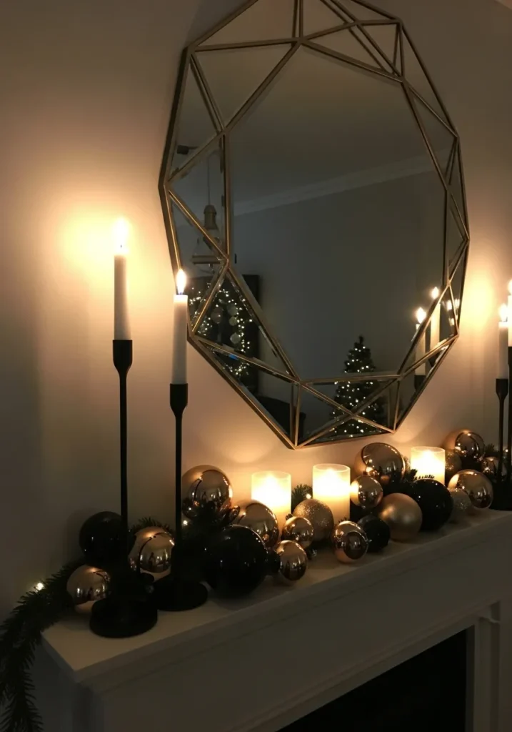 This moody, glamorous mantle plays with dark elegance and candlelit glow. Sleek black candlesticks, metallic ornaments, and soft candlelight create a striking contrast that feels ultra-sophisticated. The geometric mirror above bounces the light beautifully, adding depth and sparkle to the whole look.