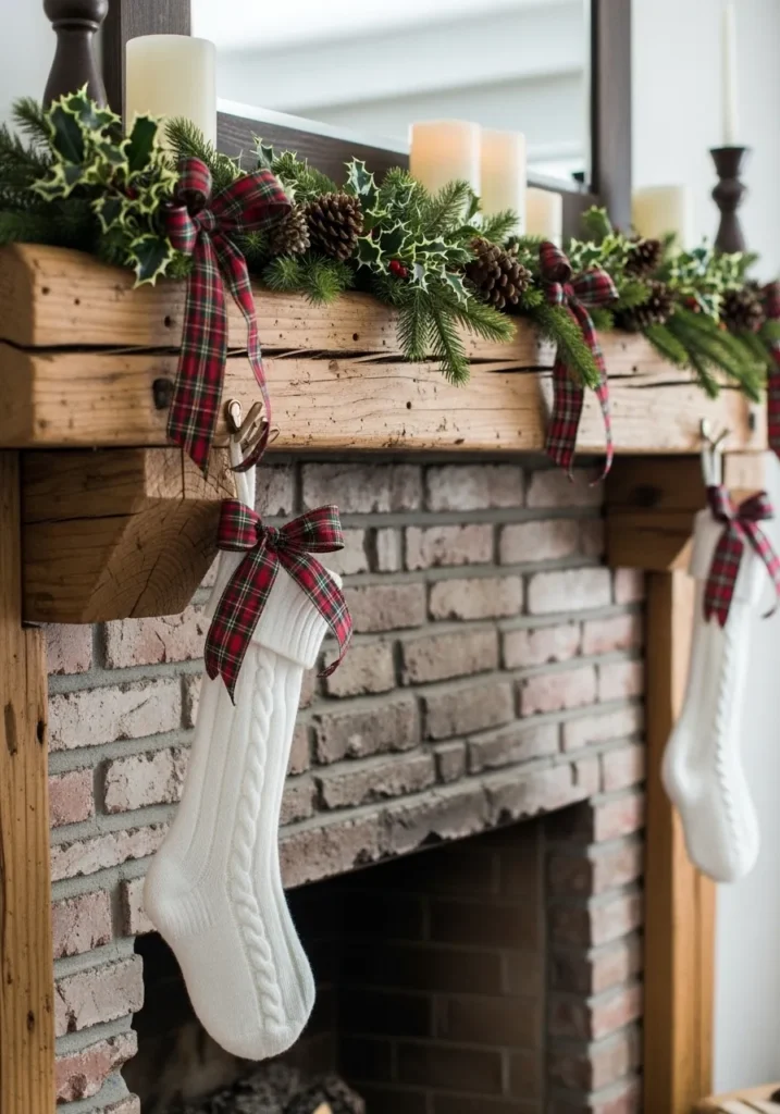 This design brings classic holiday coziness to life. A rustic wooden beam is decorated with pine branches, holly leaves, pinecones, and red tartan bows that add a nostalgic, heartwarming touch. White cable-knit stockings hang perfectly beneath, tying everything together with that timeless, cozy cottage charm.