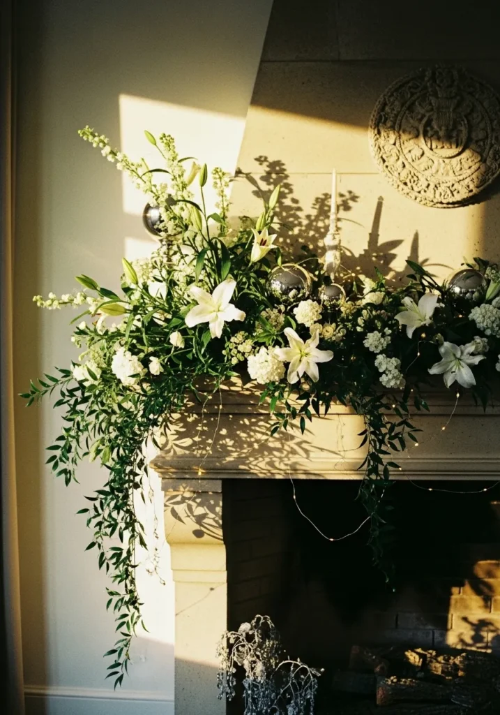 This breathtaking design transforms the fireplace into a lush floral masterpiece. White lilies and blooms cascade over soft greenery, dotted with silver ornaments and twinkling fairy lights that catch the afternoon sun. It feels grand and delicate all at once, like a winter garden brought indoors.