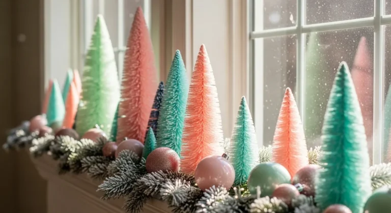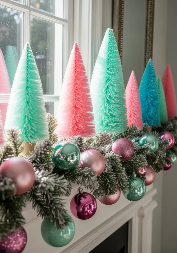 This colorful mantle is all about bringing fun, retro-inspired cheer into the room. Frosted greenery is topped with glossy pastel ornaments in shades of mint, pink, and lavender, while bottlebrush trees in matching hues line the top like a candy-colored forest. The result feels like a playful nod to vintage Christmas decor, yet it still looks perfectly polished and modern.