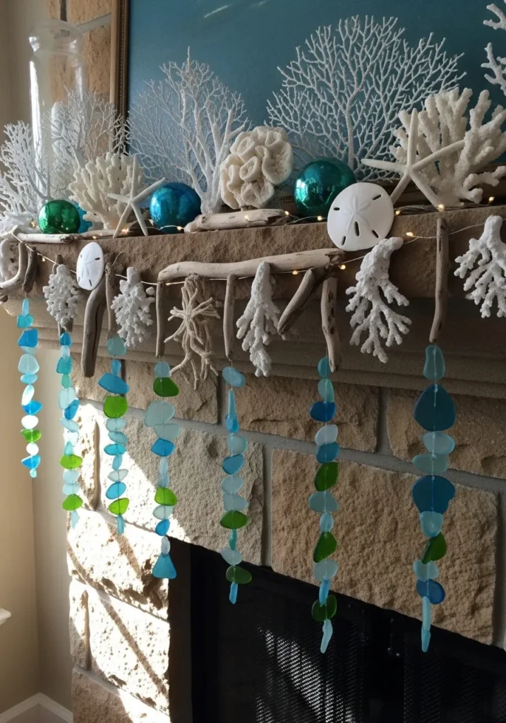 This beach-inspired mantle brings ocean vibes to the holidays in the prettiest way. White coral, starfish, sand dollars, and driftwood are paired with sparkling blue and green glass ornaments, creating a coastal twist on classic Christmas. The sea glass garlands hanging below shimmer beautifully in the sunlight, making the entire display feel airy and fresh.