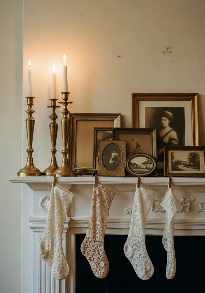 This charming mantle tells a story of timeless beauty. Lace stockings hang delicately beneath vintage brass candlesticks and sepia-toned portraits framed in gold. The combination of warm candlelight and antique details creates a sense of nostalgia that feels both romantic and sophisticated.