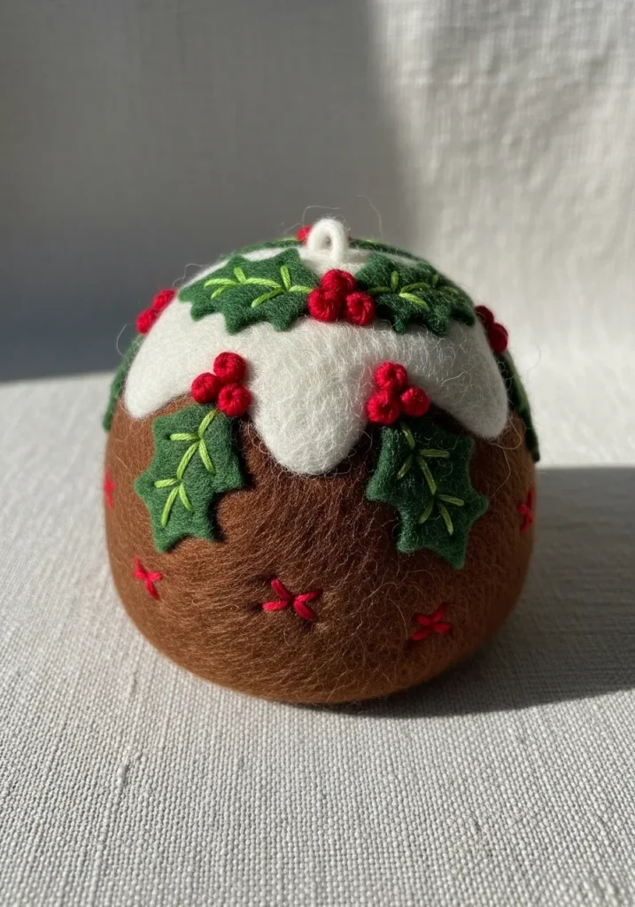 This adorable felt ornament looks just like a classic Christmas pudding, topped with white icing and bright holly leaves. The handcrafted stitching gives it that cozy, homemade look that always feels extra special.