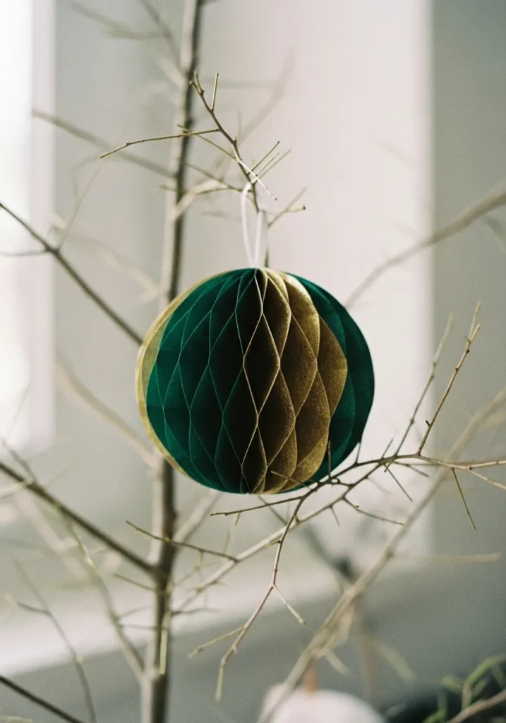 This paper honeycomb ornament is modern, minimal, and just a bit dramatic — in the best way. The emerald green and gold tones catch the light beautifully, creating a soft, luxe effect even on a simple branch.