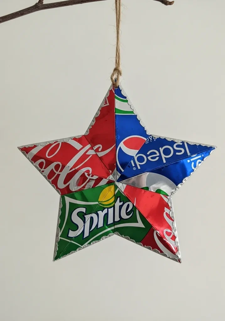 This star ornament made from recycled soda cans is the ultimate example of creativity meeting sustainability. The vibrant mix of colors gives it a playful edge, while the handmade cut and fold work adds rustic charm.