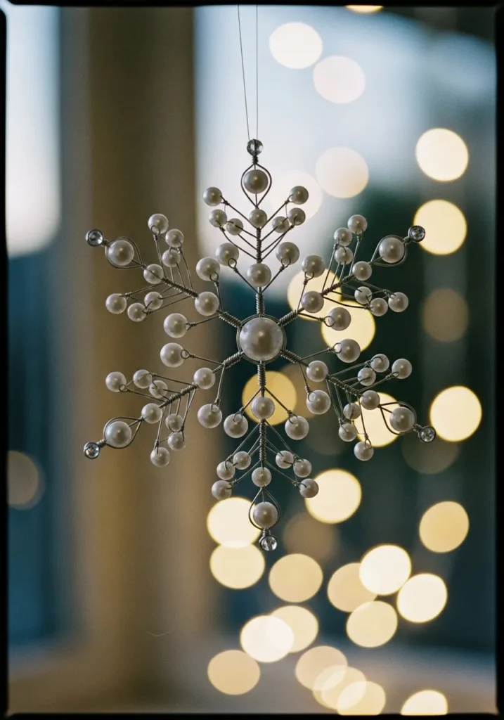 This ornament looks like it could belong in a winter fairytale. The pearl beads shimmer under soft lights, giving it a delicate glow that feels both elegant and timeless. The metal wiring adds a touch of modern detail, making it perfect for anyone who loves a little sparkle without going over the top.