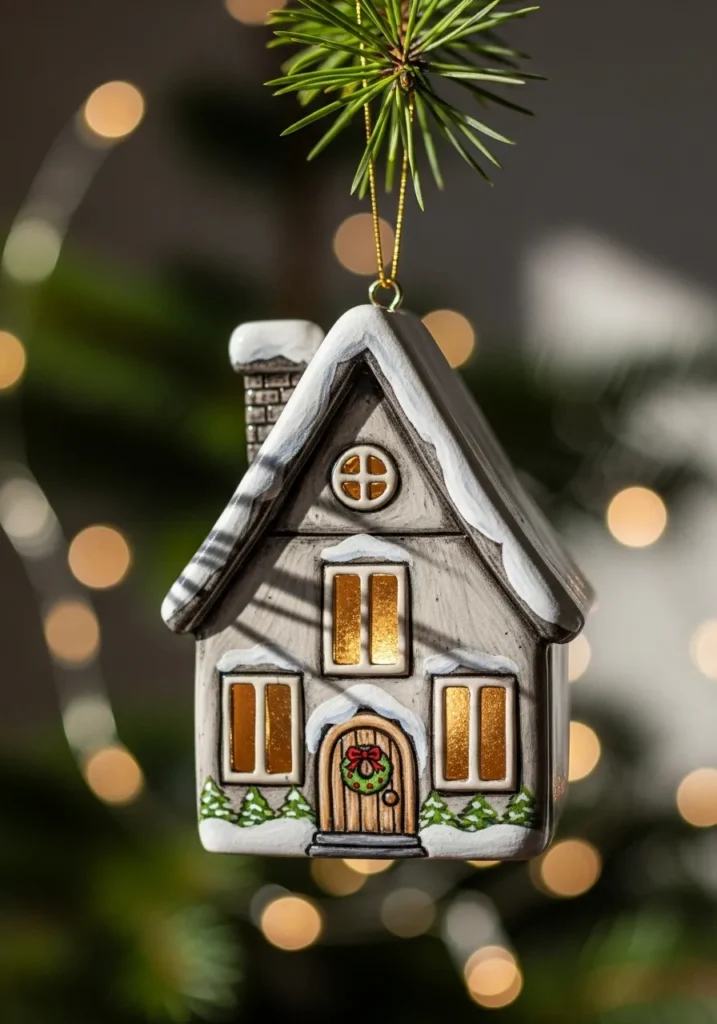 This charming little cottage ornament looks like it was plucked straight from a Christmas storybook. The snow-topped roof, glowing golden windows, and tiny wreath on the front door make it feel so warm and welcoming. It’s the perfect mix of nostalgia and cozy charm, like the kind of house you’d want to escape to during the holidays.