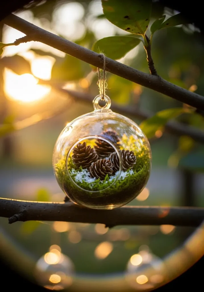 Inside this glass globe, there’s an entire miniature forest — tiny pinecones, bits of moss, and a dusting of snow that looks almost real. Hanging from a branch, it captures sunlight like a little world of its own.