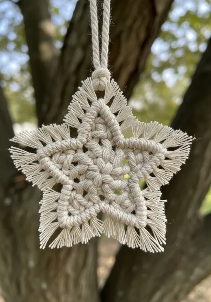 This cream-colored macramé star ornament is a boho dream. The woven cotton threads and fringed edges give it a soft, airy texture that feels effortlessly stylish and homemade.