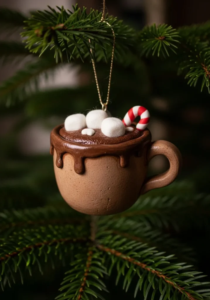 A cup of cocoa turned into an ornament? Yes, please. This tiny clay mug overflowing with marshmallows and a candy cane handle looks almost too cute to be real. It’s playful, cozy, and guaranteed to make you smile.