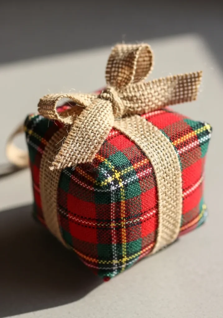 This adorable ornament looks like a tiny wrapped present straight out of a cozy country Christmas. The red and green plaid fabric feels perfectly festive, while the burlap ribbon gives it that rustic, handmade charm. It’s the kind of ornament that makes your tree feel like it’s dressed in flannel pajamas.