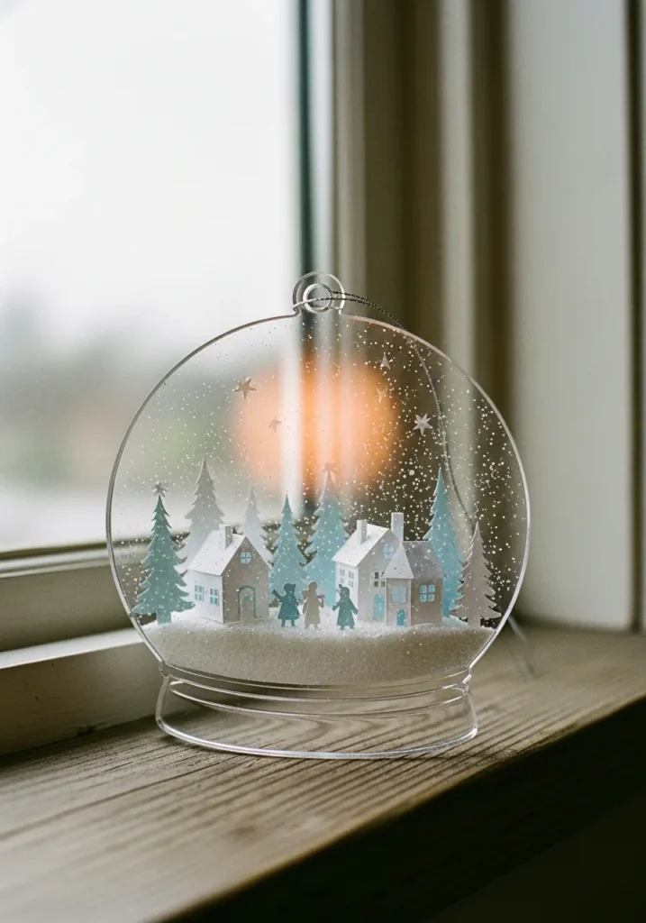 This clear ornament turns a simple window ledge into a tiny snow-covered wonderland. Inside, little pastel houses sit among pine trees, with tiny figures frozen in a peaceful winter evening. It’s sweet, nostalgic, and full of charm.