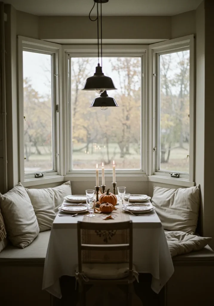 This charming little breakfast nook captures the soft side of fall. A small table is set by the window with cushioned benches, simple dinnerware, and a trio of pumpkins surrounded by glowing candles. The foggy view outside adds a dreamy calm to the whole space.