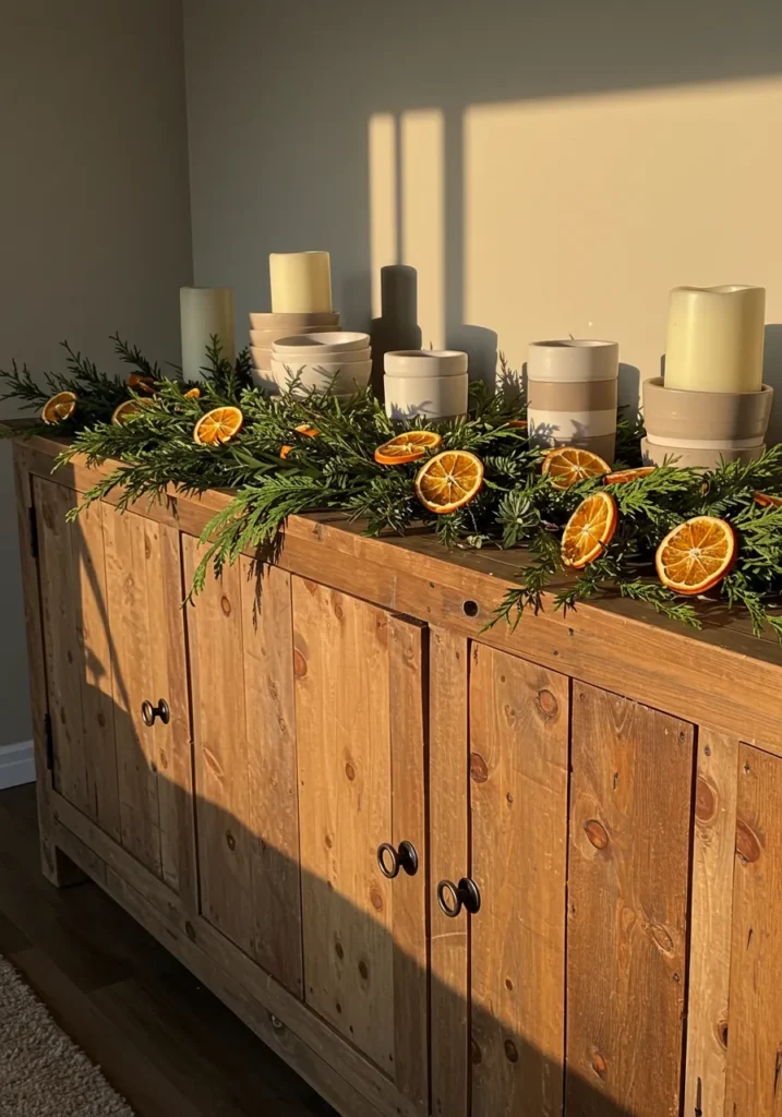 This rustic wooden sideboard is a perfect mix of simple and festive. Greenery is draped across the top, dotted with slices of dried orange that catch the sunlight beautifully. Neutral ceramic jars and candles complete the look without making it feel cluttered.