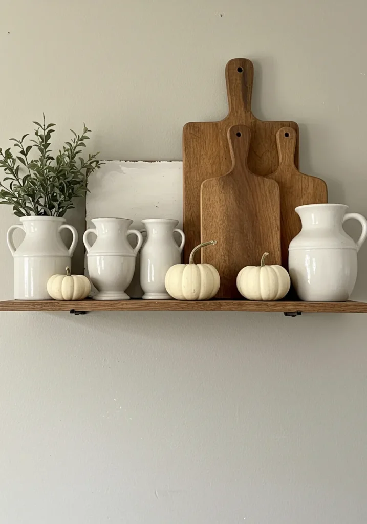 This shelf setup is farmhouse minimalism at its best. White ceramic pitchers, wooden cutting boards, and small white pumpkins line up neatly, creating the perfect balance of texture and tone. It’s clean, cozy, and beautifully understated.