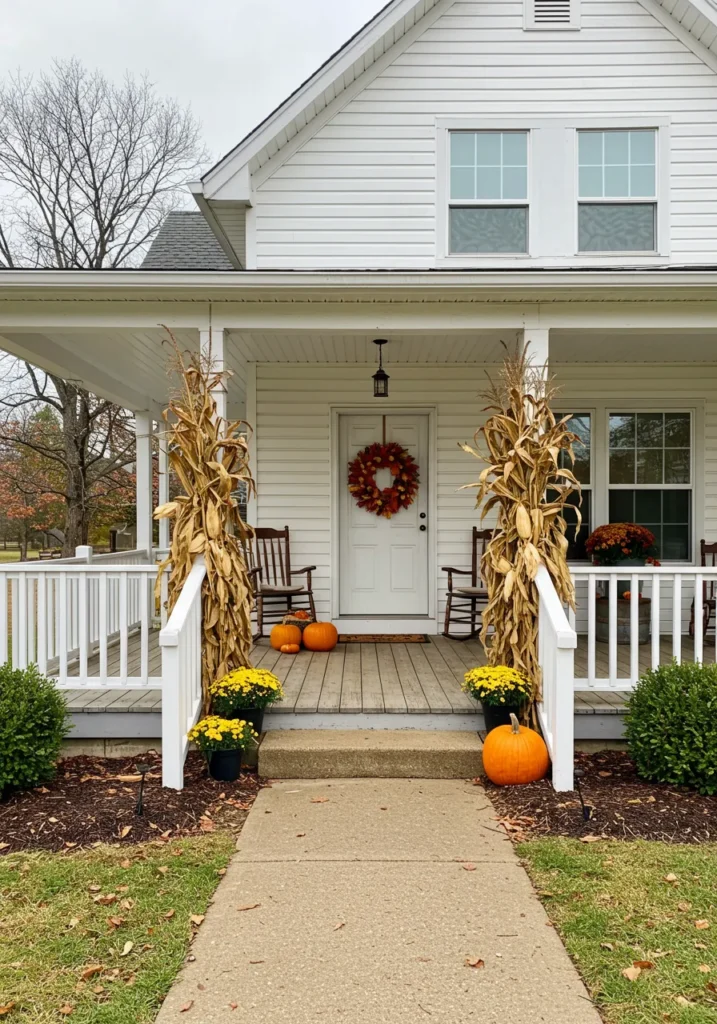 This farmhouse porch is pure Thanksgiving nostalgia. Corn stalks frame the doorway, pumpkins sit neatly along the steps, and bright yellow mums bring everything to life. The crisp white siding makes the warm autumn colors pop in the best way.