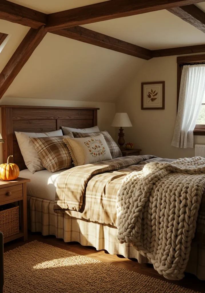 This bedroom looks like a warm hug on a chilly fall morning. The plaid bedding, chunky knit throw, and little pumpkin on the nightstand make it feel charming and seasonal. Wooden beams overhead and soft sunlight give it that classic farmhouse coziness.