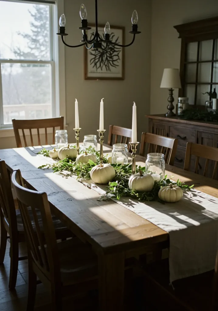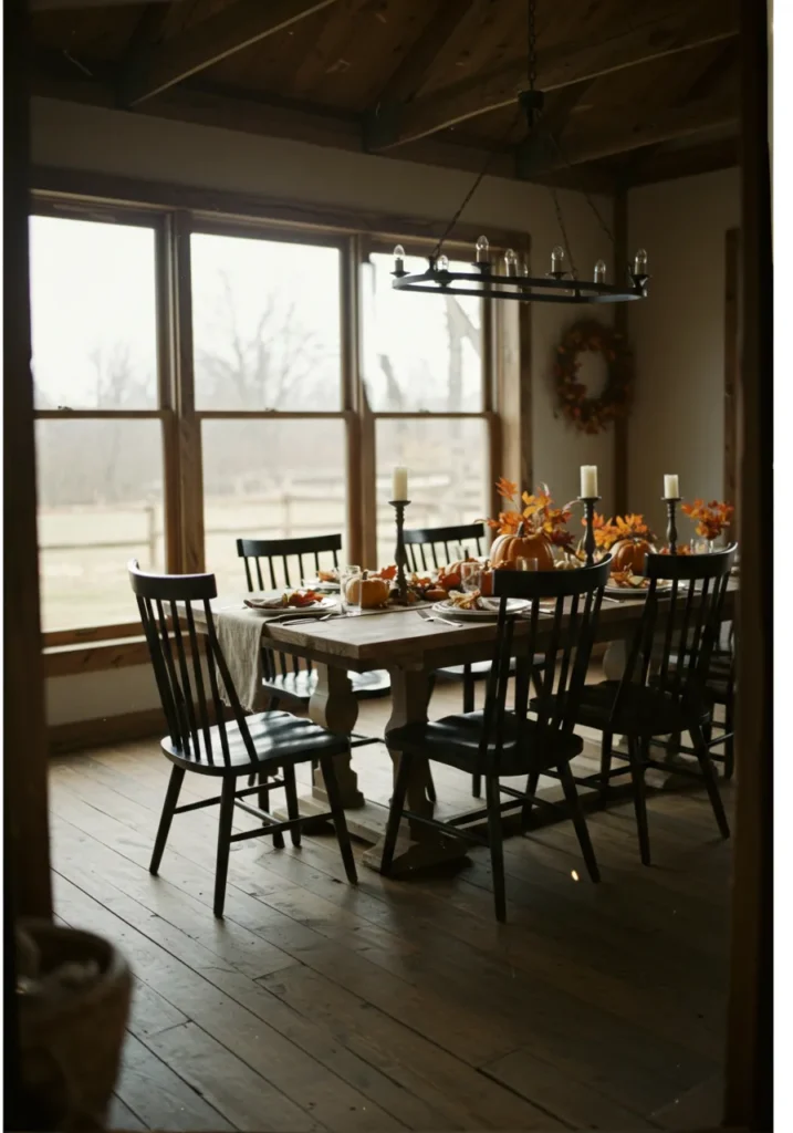 This dining space feels like a cozy escape on a cool fall day. The wooden table is set with pumpkins, candles, and warm orange leaves that echo the view outside the big farmhouse windows. The black chairs and simple chandelier add a classic touch that grounds the room while the soft natural light makes everything glow.