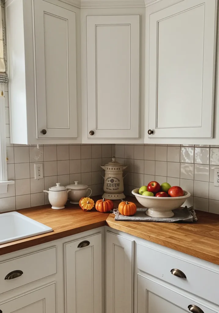 This cozy kitchen corner captures Thanksgiving spirit with the simplest details. Wooden countertops, a bowl of crisp apples, and a few bright pumpkins bring a natural touch of color to the creamy white cabinets. Everything feels rustic yet refined.