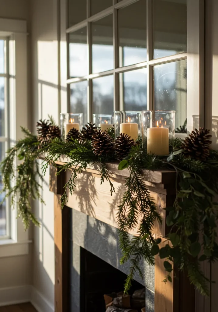 This farmhouse mantel feels magical in the afternoon sun. Greenery drapes softly along the wood, accented by pinecones and flickering candles that give off the perfect cozy glow. The reflection in the window adds that extra bit of warmth that feels like home.