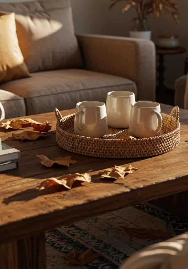 This coffee table scene captures fall in the coziest way. A woven tray with mugs sits on a wooden surface scattered with golden leaves. The sunlight hits just right, giving the whole room a soft, golden warmth.