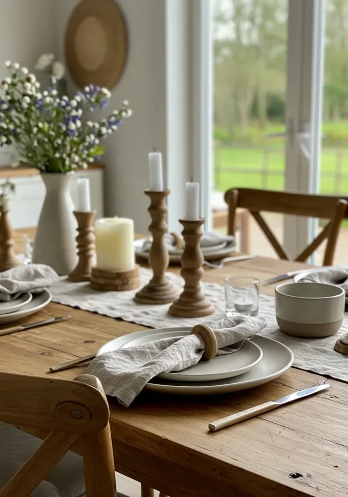 This dining table is a perfect example of quiet elegance. Wooden candle holders, linen napkins, and neutral plates sit neatly on a textured table runner. The natural light from the windows makes the entire setup glow in the softest way.
