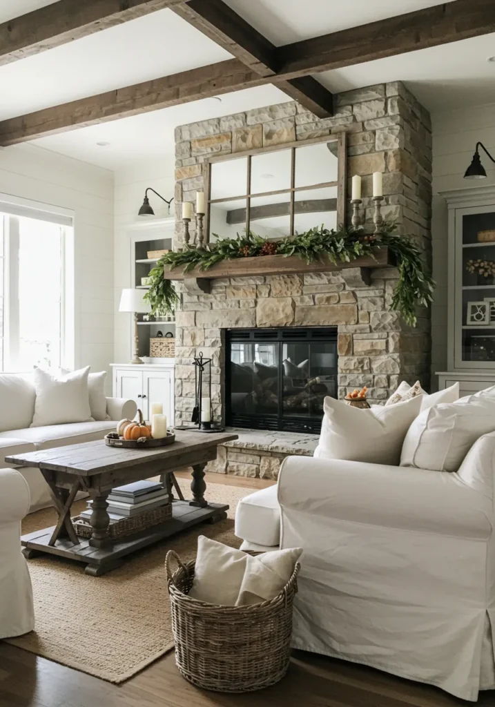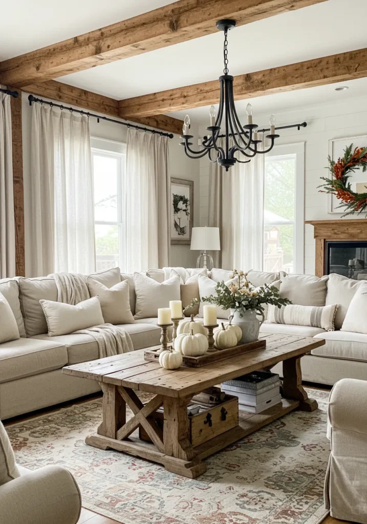 This living room is the definition of cozy farmhouse perfection. Creamy sofas, rustic wood beams, and a reclaimed coffee table make the space feel soft and welcoming. White pumpkins, candles, and a simple fall wreath tie it all together in a way that feels seasonal without being overdone.