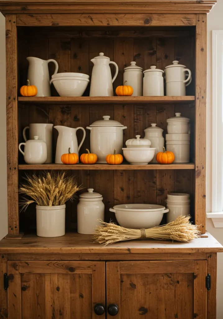 This wooden hutch is farmhouse perfection. Rows of cream ceramics line the shelves, accented by pops of orange from small pumpkins and a bundle of dried wheat. The natural wood backdrop ties everything together with that classic rustic charm.